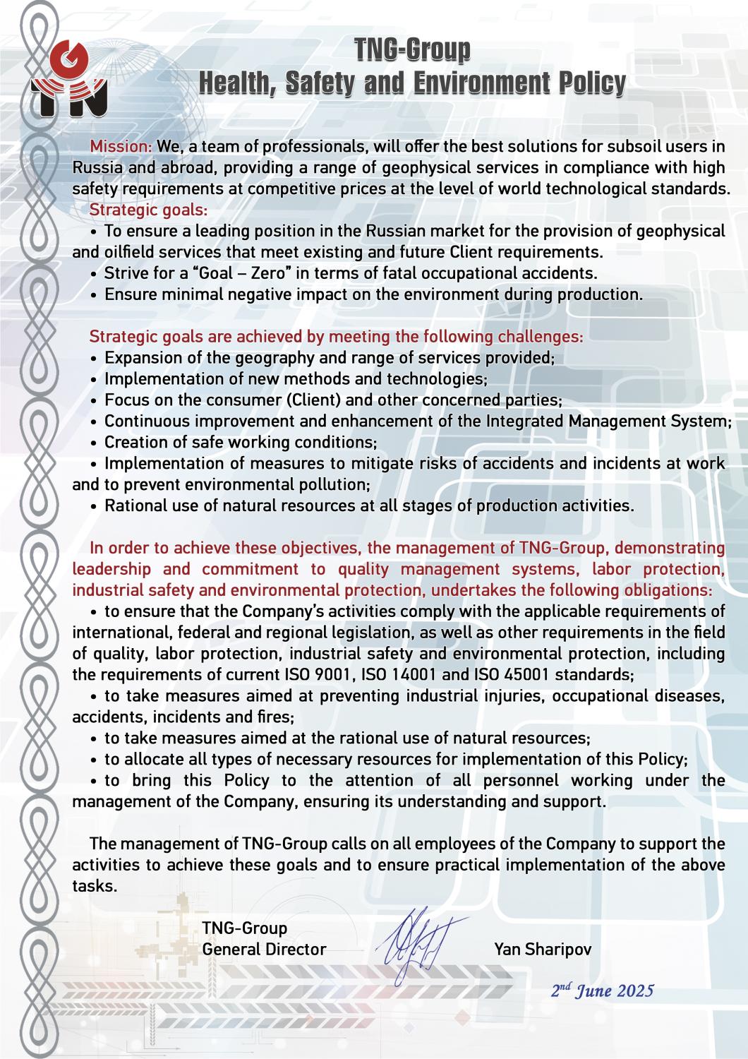 TNG-Group has introduced and certified quality management system in compliance with international standard DIN EN ISO 9001:2008. Work safety certificate has been acquired. International standards DIN EN ISO 14001:2007, OHSAS 18001:2007 have been introduced in order to create a unified and integrated management system.